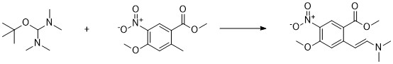 The solid compound was collected by filtration and dried to provide of methyl (E)-2-[2-(dimethylamino)vinyl]-4-methoxy-5-nitrobenzoate (12) (3.6 g (96%) as an orange colored solid;
